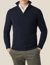 This cable knit zipper sweater combines a textured knit with a zippered front to give simple, reliable function. The cable pattern adds structure to the fabric. The zipper lets you open or close the front to control warmth and airflow.