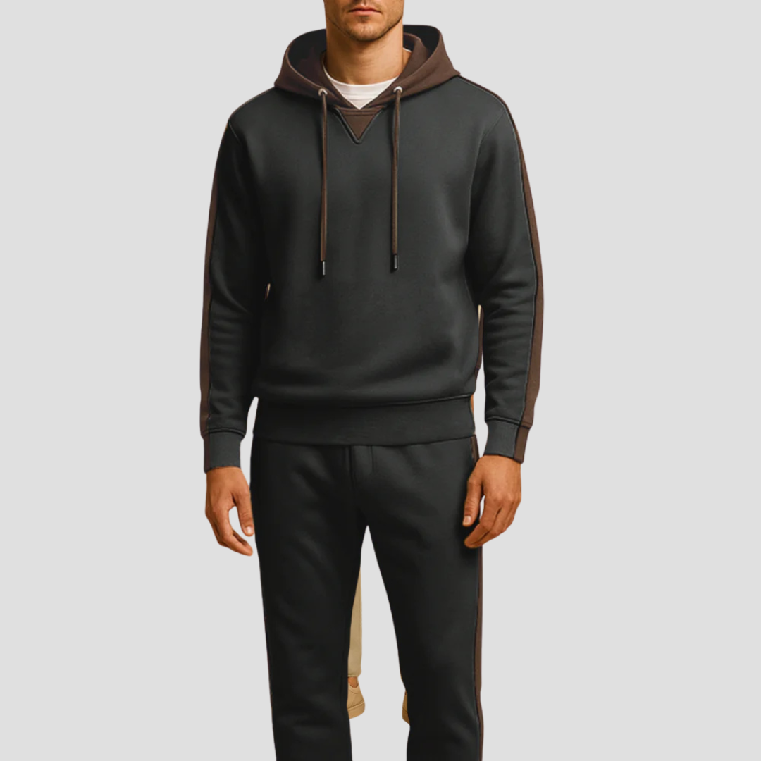The Laurevain men’s tracksuit set blends modern comfort with sleek two-tone styling. Crafted from premium terylene fabric, it offers a smooth, lightweight feel and excellent shape retention. The hoodie and joggers combine relaxed tailoring with a refined silhouette for everyday ease and understated sophistication.